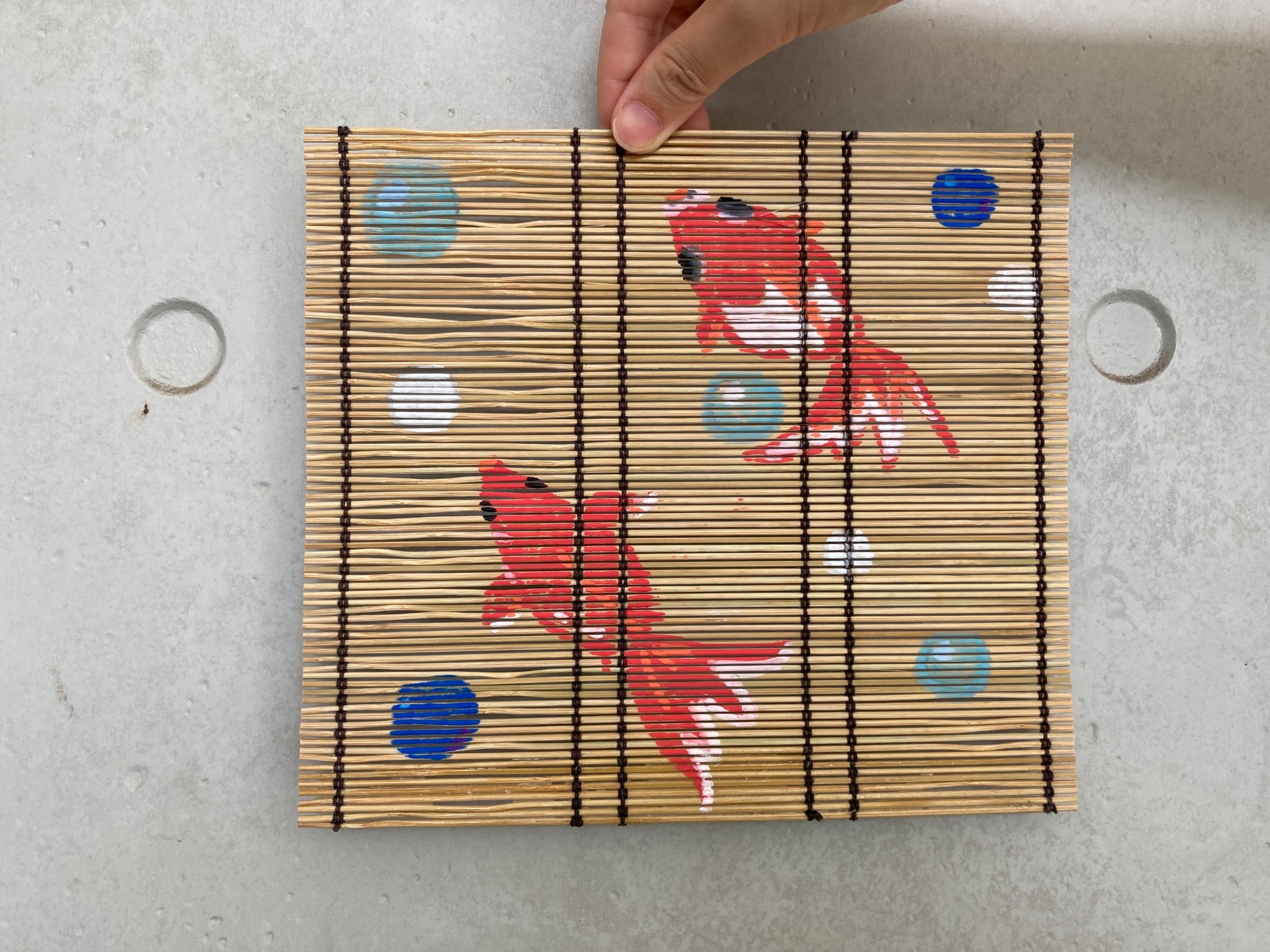 今回のワークショップでは、お子様向けには「すだれにお絵描きアート体験」を実施します。こちらは福岡県八女市の名産品である「竹すだれ」に絵付けをする体験となります。小さなお子様や絵が苦手という方でも簡単に製作できるように「ステンシルシート」をご用意しております。