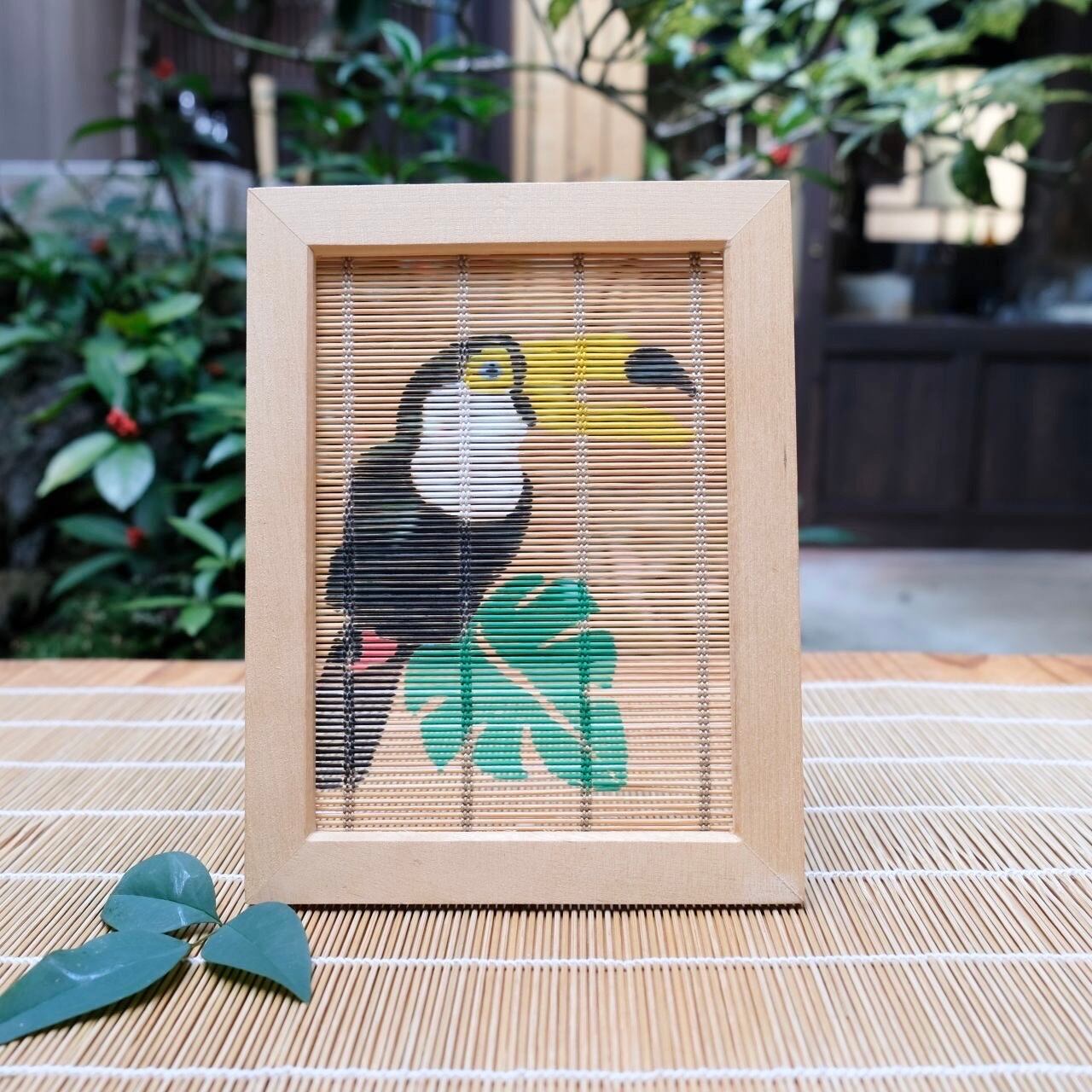 色鮮やかなオニオオハシのデザインを取り入れた【インテリアART】すだれアートパネルが新登場です!このユニークなアイテムは、南国の楽園を思わせる生命感あふれるデザインで、居住空間にエネルギーと活気をもたらします。オニオオハシの存在感が、特別な空間を演出し、訪れる人々に笑顔を届けることでしょう。